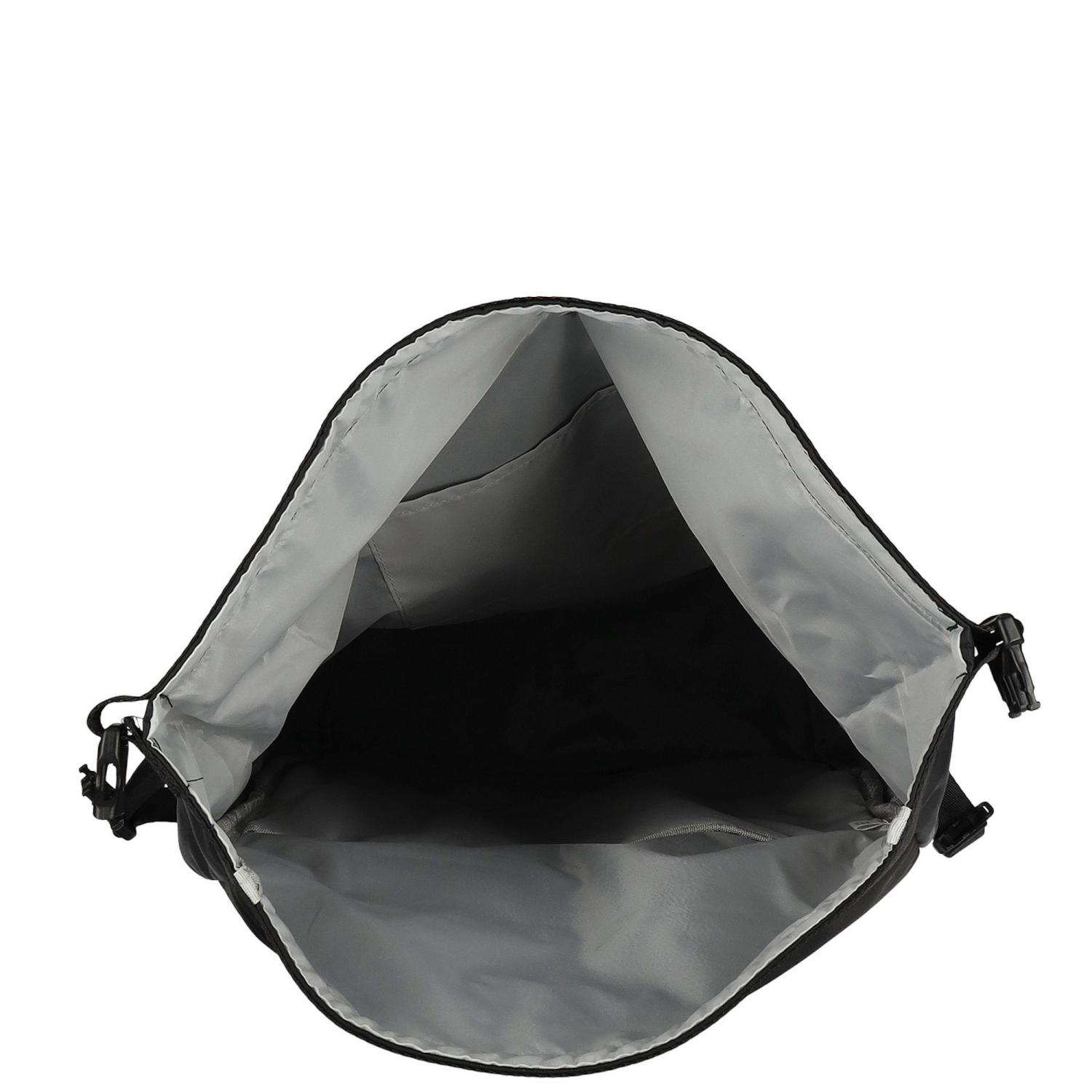 Hlavní prostor se uzavírá pomocí rolování a pevné spony, což pomáhá chránit obsah před deštěm i nechtěným otevřením.