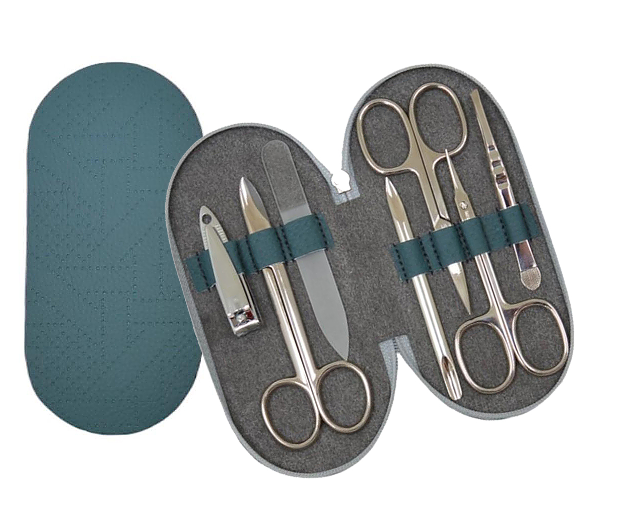 Elegantní manikúrní sada v luxusním pouzdře z koženky v petrolejové barvě s jemným náznakem perforace. Pouzdro je uzavíratelné na zip, takže všechny nástroje zůstávají bezpečně na svém místě – ideální jak pro domácí použití, tak na cesty.