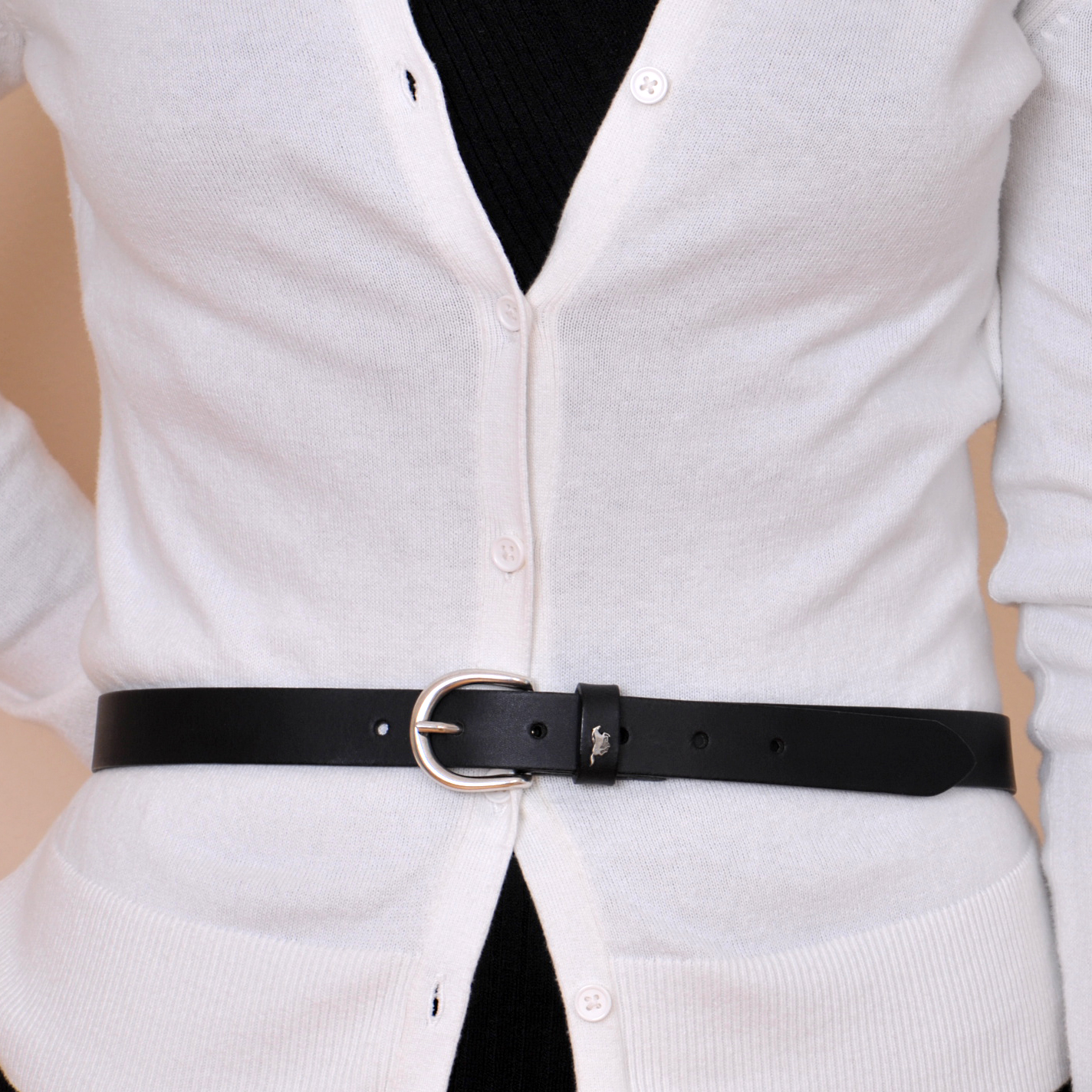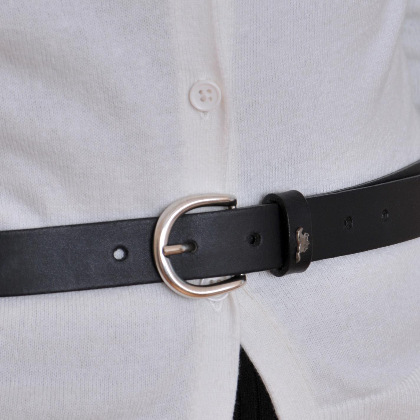 Černý dámský kožený pásek o šířce 2,5 cm má pěknou malou sponu s povrchovou úpravou NKS (nikl satinato). Tato spona obsahuje nikl. Pásek je vyrobený z kvalitní kůže. Na výběr máte z různých délek opasků. Spona je k opasku přišitá napevno.