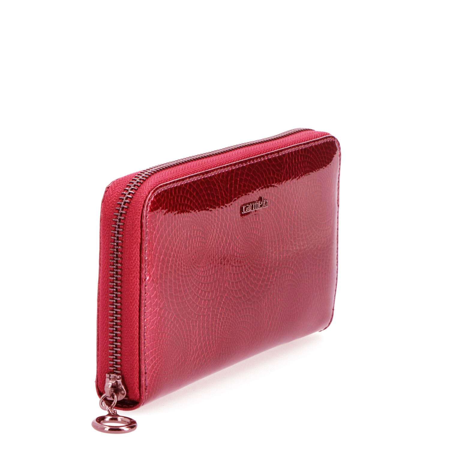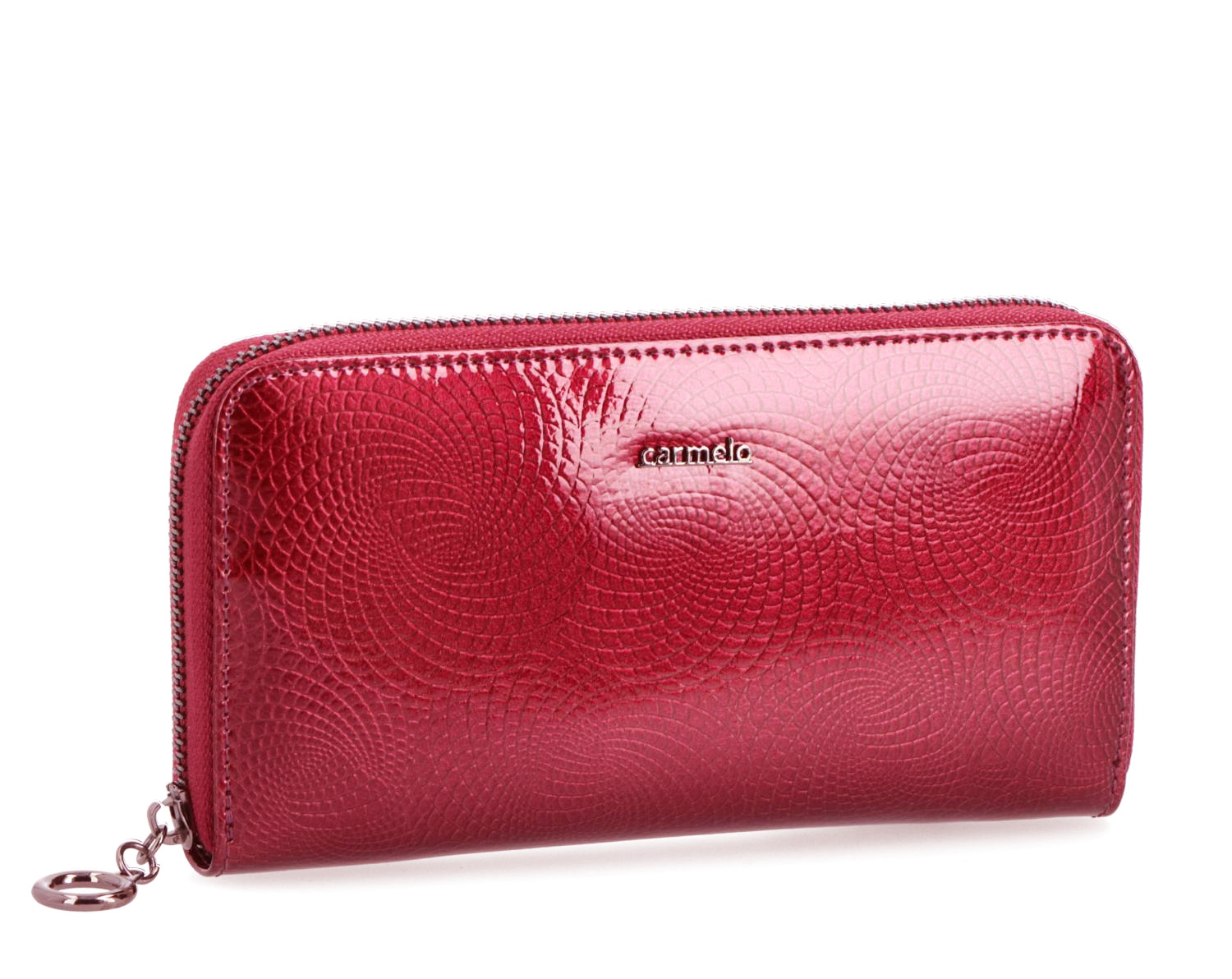 Luxusní dámská peněženka značky CARMELO vyrobená z lakované kůže s jemným motivem vytlačovaných zdobných koleček, který peněžence propůjčuje elegantní a nevšední vzhled. Prostorná peněženka se zipovým zapínáním nabízí dostatek místa pro všechny vaše bankovky, mince i platební karty. Na přední straně je decentní logo CARMELO.