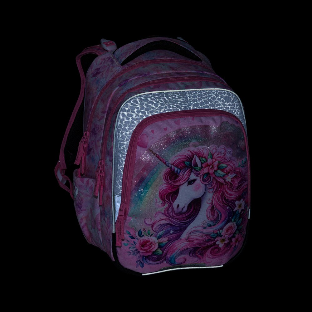 Lehký školní batoh s hmotností pod 1 kg, navržený pro pohodlné každodenní nošení. Design s jednorožcem a třpytivými detaily potěší malé školačky, zatímco funkční řešení ocení rodiče.